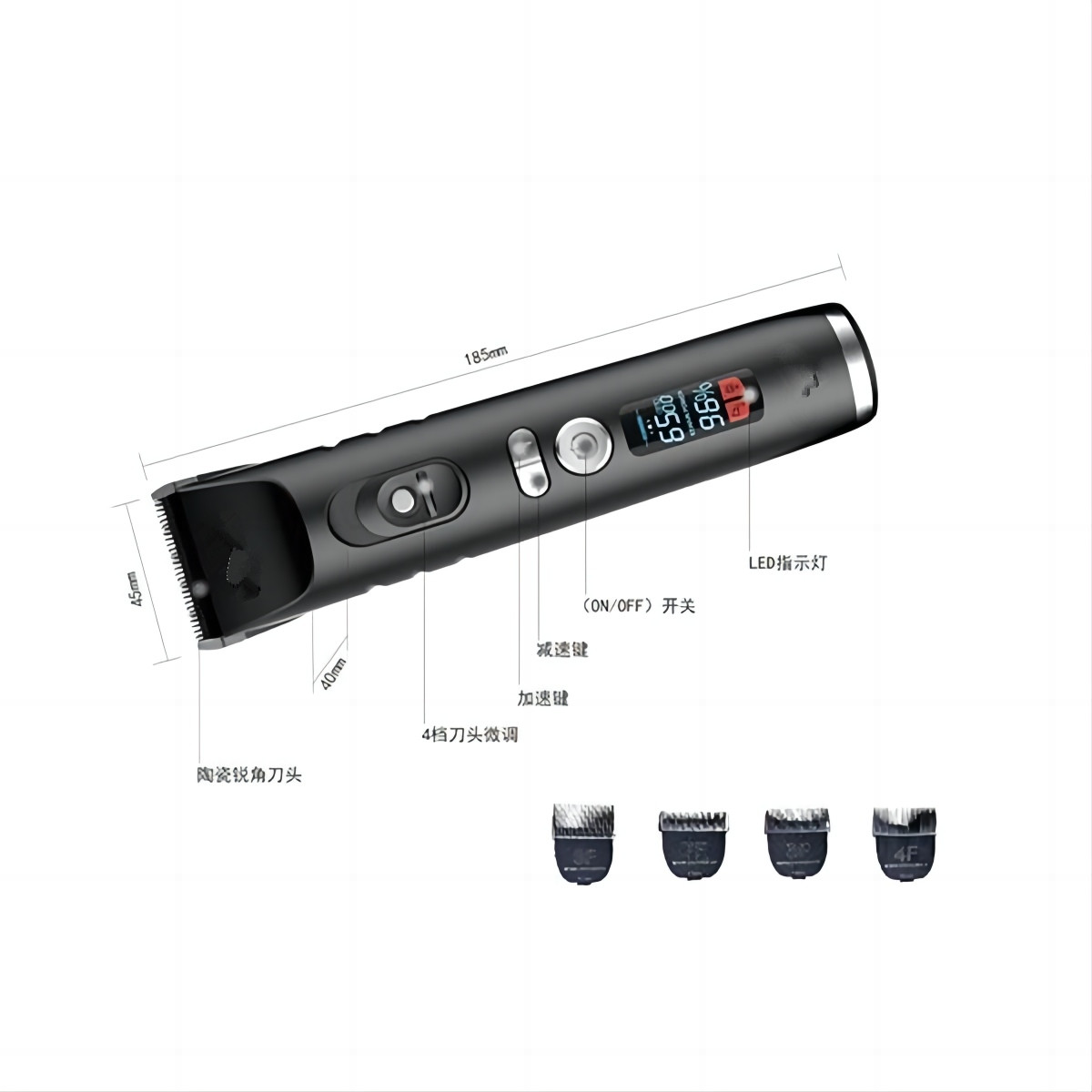 • ကြည်လင်ပြတ်သားသော LED ဖန်သားပြင်သည် ဘက္ထရီအဆင့်ကို အချိန်နှင့်တပြေးညီပြသပေးကာ အလှပြင်နေစဉ်အတွင်း ပါဝါပြတ်တောက်မှုကို ကာကွယ်ပေးပြီး အိမ်တွင်းအလှပြင်ခြင်း သို့မဟုတ် အလှပြင်ဆိုင်ဝန်ဆောင်မှုများကို ပိုမိုချောမွေ့စေပါသည်။